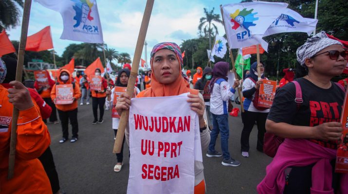 Para Perempuan pekerja, dan aktivis melakukan aksi damai memperingati Hari Perempuan Global 2025 di kawasan Monas, Jakarta, Minggu (09/3/2025). Dalam aksinya mereka menuntut pemerintah Buat melidungi pekerja di sektor rentan, salah satunya dengan segera mengesahkan Undang-Undang Perlindungan Pekerja Rumah Tangga atau UU PPRT. MI/Usman Iskandar/Ppj