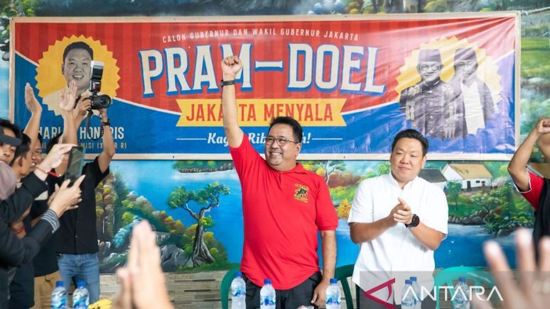 Pria yang akrab disapa “Si Doel” itu ditemani Bendahara Tim Pemenangan Pramono-Rano yang juga anggota DPR RI Charles Honoris.