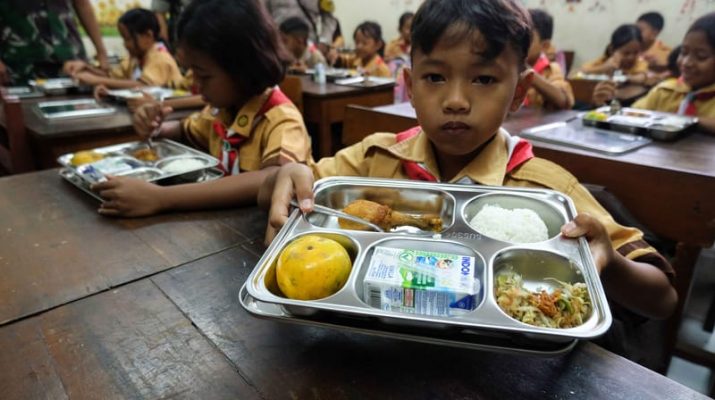 Siswa menunjukkan menu makanan Begitu uji coba program Makan Bergizi Gratis (MBG) di SD Negeri Kepatihan Solo, Jawa Tengah, Jumat (10/1/2025). Program MBG di Solo rencananya akan berlangsung perdana mulai Senin (13/1/2025). ANTARAFOTO/Maulana Surya/Per