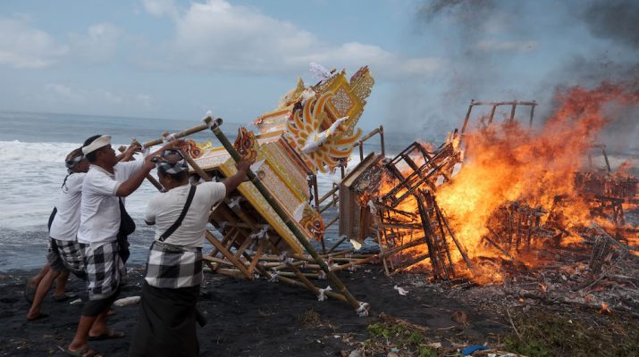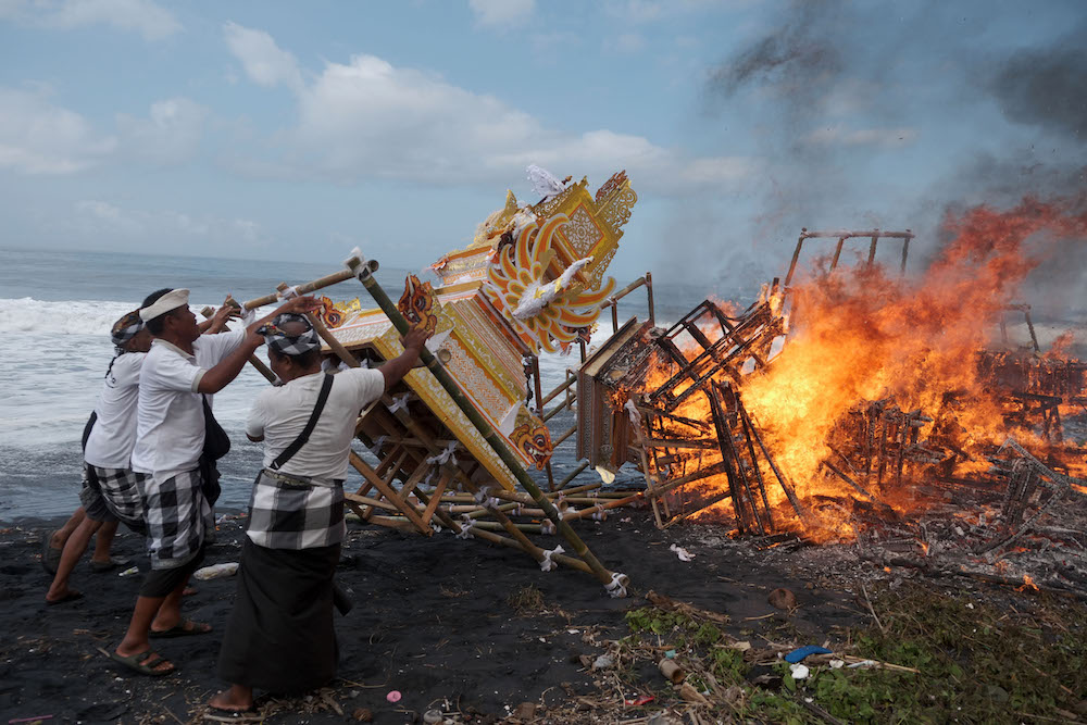 Umat Hindu membakar sarana upacara Demi rangkaian Upacara Baligia Bukhur di Pantai Masceti, Gianyar, Bali, Senin (28/7/2025). Upacara yang digelar oleh Puri Saren Kangin Keramas tersebut dilakukan setelah upacara pelebon atau ngaben berskala besar terhadap tokoh puri setempat. Upacara terakhir kali dilaksanakan pada tahun 1995 sebagai bentuk penyucian roh leluhur atau Personil keluarga yang telah meninggal dunia agar memperoleh tempat yang lebih Berkualitas di alam baka.ANTARA FOTO/Nyoman Hendra Wibowo/sas