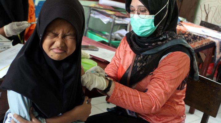 Petugas medis menyuntikkan vaksin Human Papillomavirus (HPV) dalam Penyelenggaraan Bulan Imunisasi Anak Sekolah (BIAS) di SDN Beran 5, Ngawi, Jawa Timur, Kamis (4/9/2025). Program BIAS di Daerah tersebut menyasar 10.500 anak dari siswa kelas 1, 2, 5, dan 6 Kepada memberikan perlindungan terhadap penyakit berbahaya seperti campak, rubela, difteri, tetanus, serta kanker serviks. ANTARA FOTO/Ari Bowo Sucipto/sas