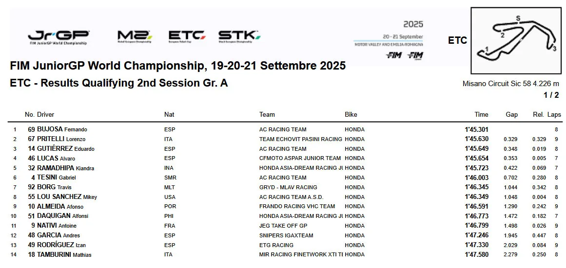 liputanindo.com – Bagus kelas Moto3 JuniorGP dan European Talent Cup (ETC) telah menjalani sesi Kualifikasi di seri ke 5 JuniorGP Misano 2025 yang padat dihari sabtu kemarin dan kedua pebalap Indonesia Veda Ega Pratama  dan Kiandra Ramadhipa sama sama meraih hasil yang cukup Bagus.