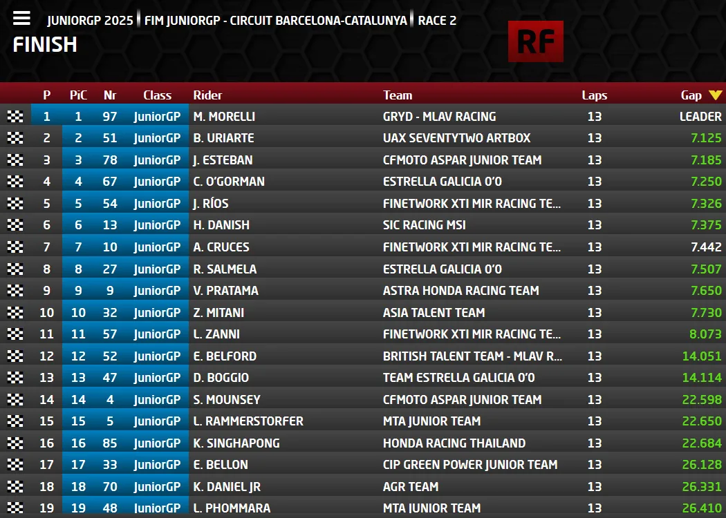 Dan akhirnya Red Flag mengakhiri race 2 JuniorGP Catalunya 2025 yang dimenangkan Oleh Morelli. Veda Ega Pratama yang berada di posisi 5 Begitu Red Flag berkibar harus menerima Fakta terkonfirmasi Finish Posisi 9 pada Race ini karena posisi finish dihitung satu lap sebelum Red Flag berkibar – @liputanindo