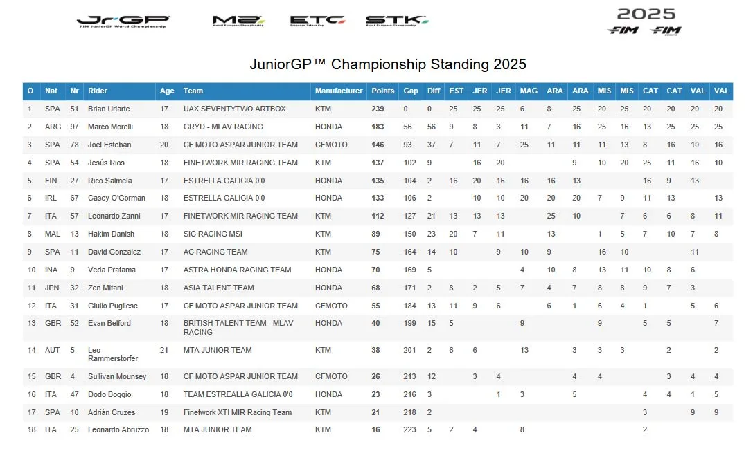 Secara Standar dalam 12 race sepanjang musim 2025, Veda Ega Pratama absen dua balapan Jerez setelah cedera pasca highside dan terjatuh di antara tikungan 11 dan 12 pada seri pembuka JuniorGP Estoril. Sehingga dengan Race 1 Valencia, total empat kali race Veda Tak memperoleh poin.