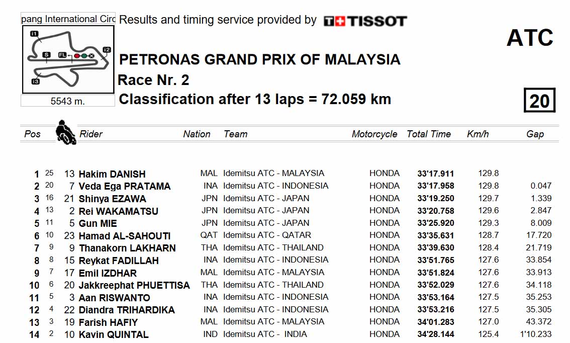 Tetapi Sulitnya race pertama akhirnnya Terbayar setelah Veda ega Pratama Berhasil finish di Posisi kedua dengan jarak yang cukup tipis 0,047 detik di belakang Pembalap Malaysia Hakim Danish . . jarak yang cukup dekat Dekat sama dengan jarak finish antara dua Pembalap Husqvarna Mc Phee dan Sasaki Di race Moto3.