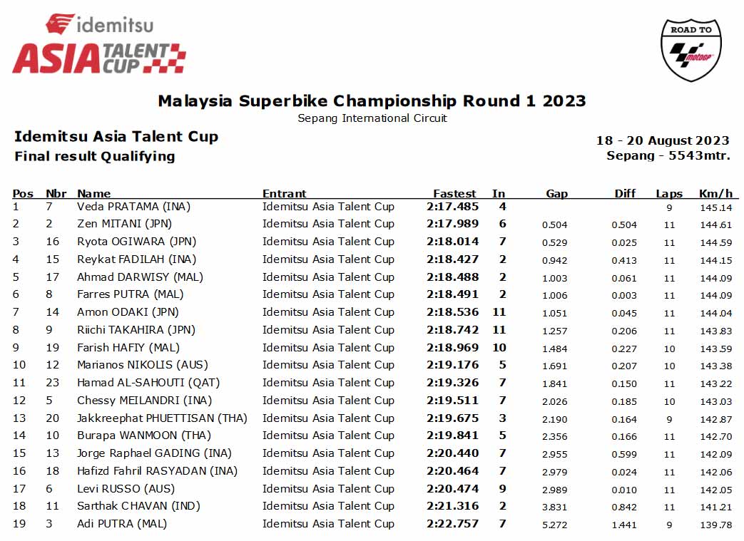 liputanindo.com – Akhir pekan ini, Asia Talent Cup Musim 2023 memasuki Seri Pertama yang bertempat di sirkuit Sepang Malaysia, berkolaborasi dengan Malaysian SUperbike (MSB) dan diikuti oleh Sekeliling 19 Starter pembalap Muda. Pada sesi Kualifikasi di pagi hari Pembalap Indonesia Veda Ega Pratama berhasil meraih Pole Position dengan menorehkan laptime 1:17,485 diikuti pembalap Jepang, Zen Mitani dan Ryota Ogiwara semetara pembalap Indonesia lainnya Reykat Fadilah start dari posisi grid 4