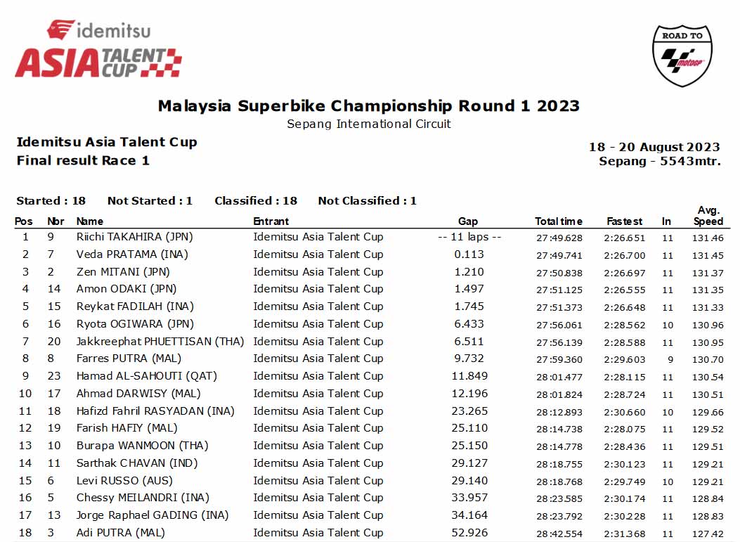 Takahira mempertahankan Keistimewaan melalui paruh pertama putaran dan berhasil menahan Veda di back Straight. Takahira Tak Membangun kesalahan di tikungan terakhir dan meraih kemenangan debutnya di ATC, Begitu Veda dan Mitani menyelesaikan podium. Race 2 esok hari ahad sendiri akan berlangsung Mulai Jam 11:05 WIB . . – @liputanindo