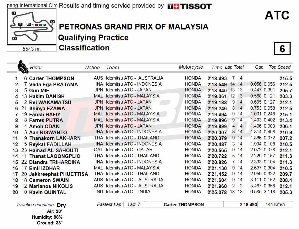 Sementara itu balik Kembali ke hasil Kualifikasi yang dihelat dalam keadaan kering dengan suhu trek mencapai 33 C, Posisi pembalap pembalap Muda Indonesia lainnya adalah Aan Riswanto di Grid 10, Reykat fadhillah grid 12 dan Diandra di grid ke 15.