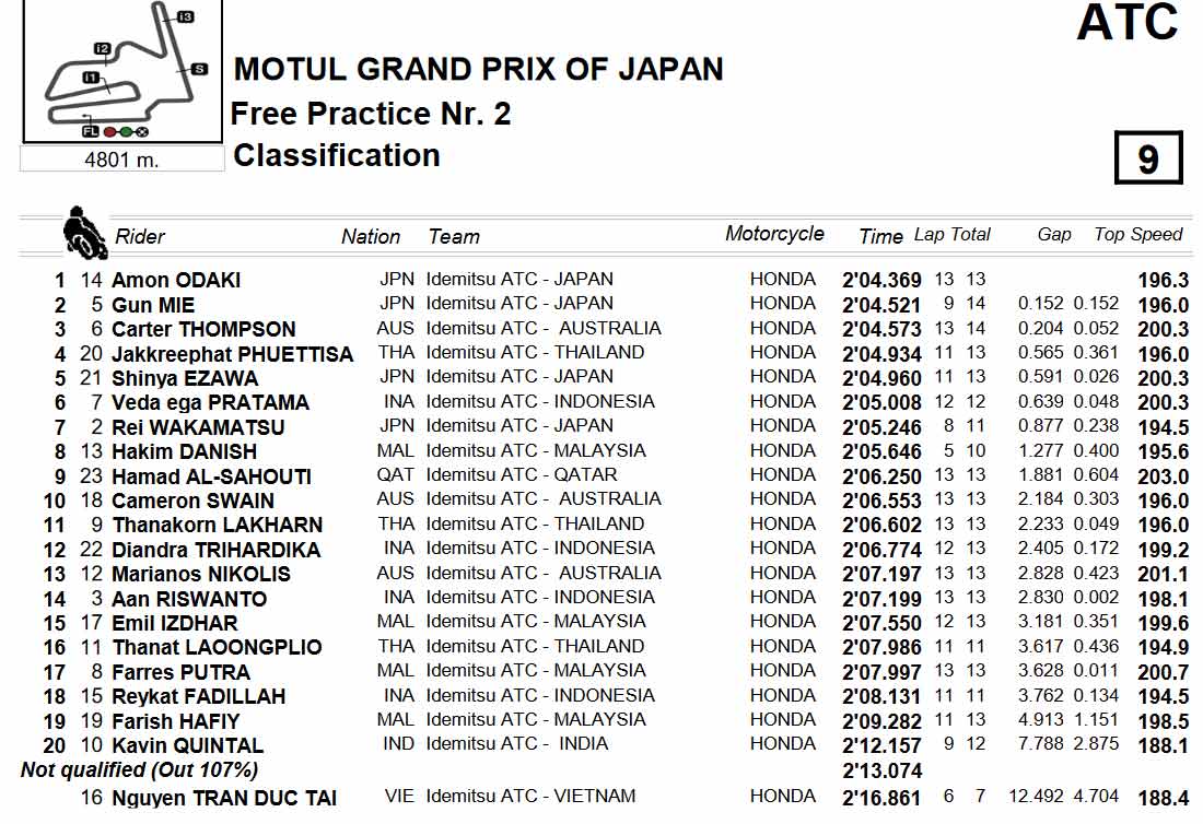 Sementara itu sesi FP2 diadakan dalam Keadaan trek yang lebih hangat dengan temperatur lintasan Di Bilangan 26º C. Di sesi ini kembali pembalap Lokal Amon Odaki menjadi yang tercepat dengan 2:04,369 . . see, lumayan 8 detik Laptime diperuncing sob. Pembalap Indoensia tercepat di FP2 kembali adalah Veda Ega Pratama di posisi 6 dengan eprbedaan laptime 0,639 detik dari Odaki.