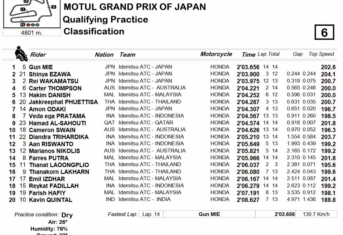 Setelah sesi FP2 hadir sesi Kualfikasi yang dihelat selama 30 menit dalam Keadaan trek kering yang degan suhu udara 26ª C dan suhu trek 32º C. Di sesi ini akhirnnya Pembalap jepang Gun Mei Hadir sebagai yang tercepat dengan laptime 2: 03,656 dan Berhak Start dari Posisi grid Terdepan pada Race nanti. Sementara itu Pembalap Indoensia terdepan di Grid start adalah Veda Ega Pratama persisnya di Grid ke 8 atau Row Ke tiga dengan Perbedaan laptime 0,911 detik dari Gun Mie. Diandra P11, Aan Riswanto P12 dan Reykat di P18