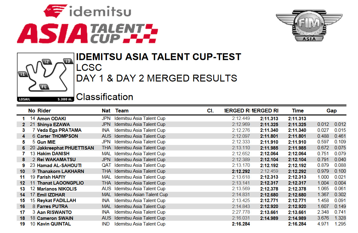 Pembalap di P1 adalah Amon Odaki, dengan pebalap Jepang menempatkan 2:11,313 Demi mengalahkan rekan senegaranya Shinya Ezawa dengan Jarak 0,012. Sebagai Surat keterangan, hanya Pemenang terakhir Taiyo Furusato yang mencatatkan Laptime lebih Segera di Race 1 musim 2021 di Lusail – balapan yang kemudian ia menangkan dengan margin tipis. Tempat ketiga dalam tes juga dekat, dengan wildcard Mandalika dan pebalap baru Veda Ega Pratama, dari Indonesia, hanya terpaut 0,027 dari Odaki.