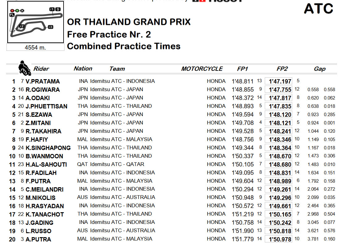 Dengan hasil ini, Secara kombinasi Veda sementara memimpin Kombinasi latihan bebas Jumat ini. Pembalap Indonesia lainnya Reyat Fadillah secara kombinasi berada di Posisi 12 sementara Chessy Meilandri di Posisi 14. Sabtu ini akan ahdir sesi Kualifikasi dan Race 1 dimana Aksi dimulai pukul 16:10 (LT GMT+7) dari Sirkuit Dunia Chang