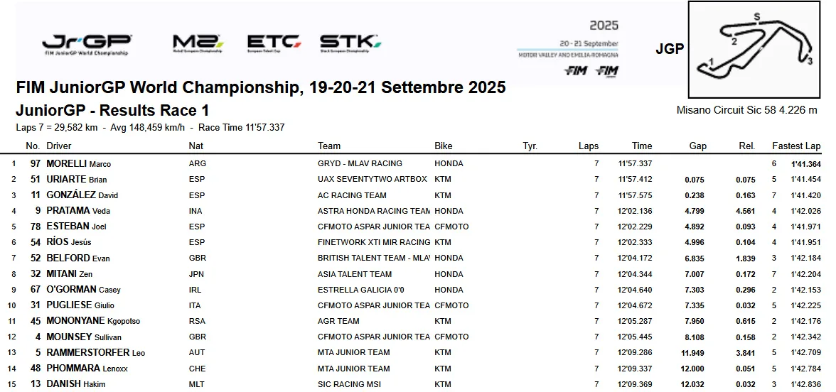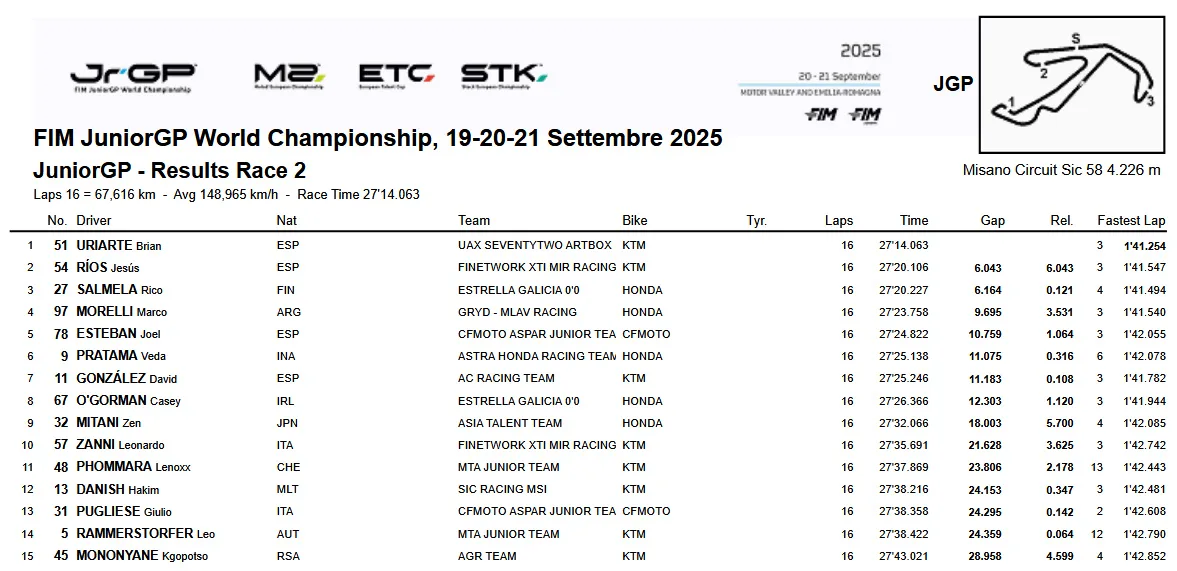 liputanindo.com – Race 1 JuniorGP Misano 2025 dengan temperatur pemukaan trek mencapai 33.7 °C, Brian Uriarte start dari posisi terdepan sementara Veda Ega Pratama start dari posisi grid ke-5. Di lap pertama Uriarte Lalu memimpin Tamat berjarak 0,133 dari Morelli sementara Veda naik ke posisi 4.