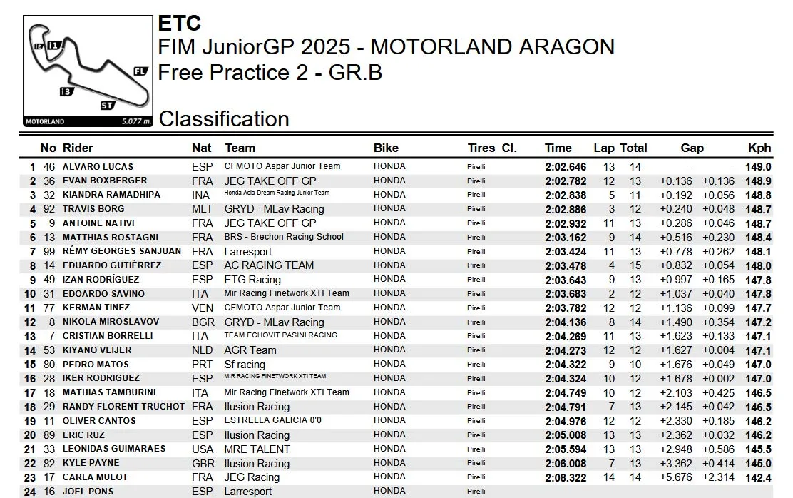 Rama berada di Posisi tiga tercepat Grup B FP2 dengan Jarak 0,192 detik dari Yang tercepat. Hari sabtu ini Kedua pebalap Indonesia akan kembali meneruskan perjuangannya di Dua kelas berbeda JrGP ini dan berharap hasil yang maksimal Demi Indonesia. – @liputanindo