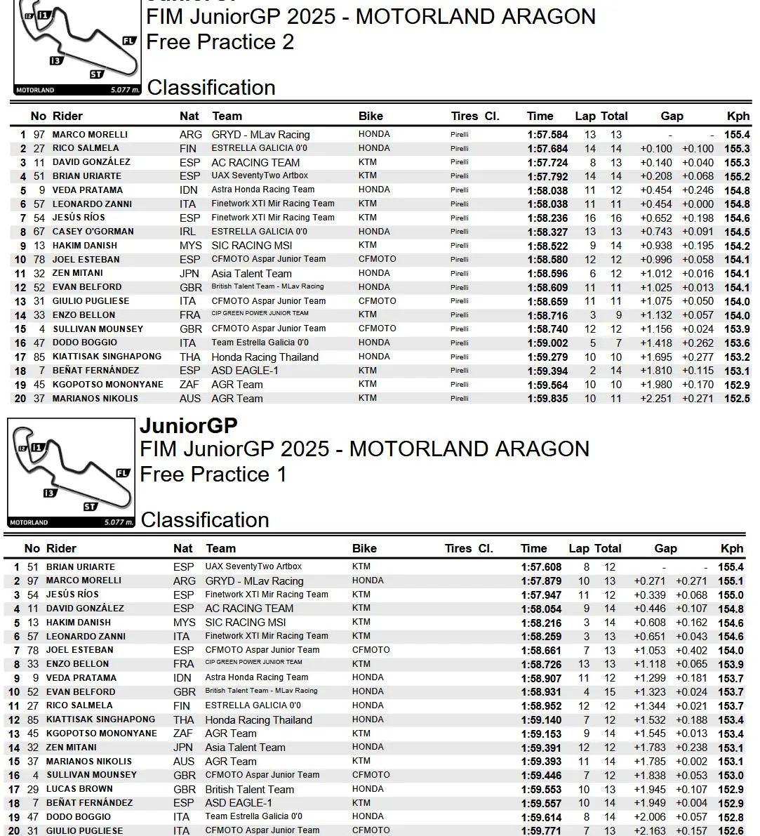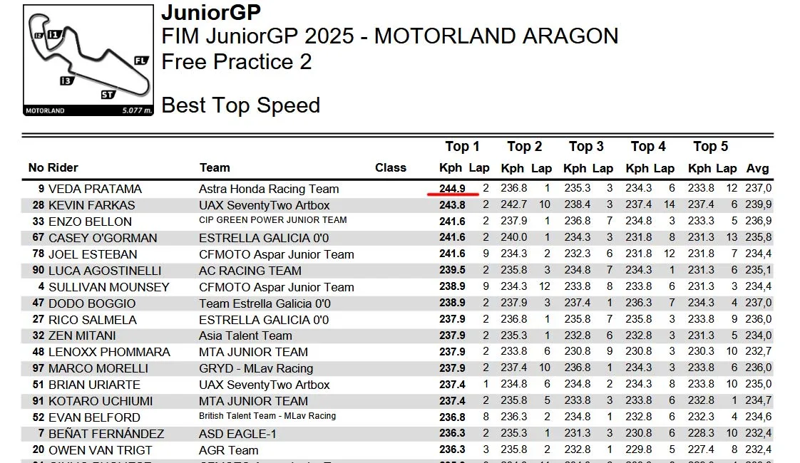 liputanindo.com – Jumat adalah Sesi Latihan Formal Race weekend JuniorGP Aragon 2025. Setelah menyelesaikan sesi FP1 di posisi 9 pada sesi FP1 dengan Modal Laptime 1:58,907, Pebalap Muda Indoensia Veda Ega Pratama Masuk Posisi Top-5 pada sesi Practice Terakhir Jumat