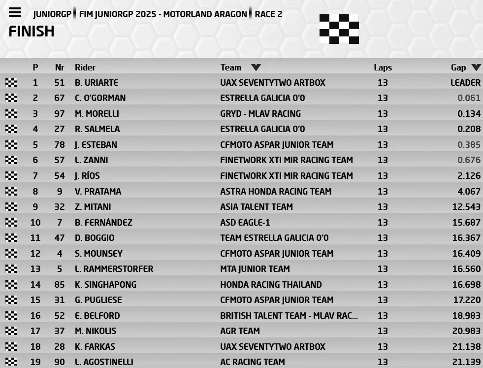 Lap 10 Veda Naik ke P6 berjarak 0,6 detik dari Uriarte. Lap 11 veda turun ke P8 Dan Setelah 13 Lap Brian Uriarte memenangkan race 2 JuniorGP Aragon 2025, sementara Veda Ega Pratama finish Posisi 8.