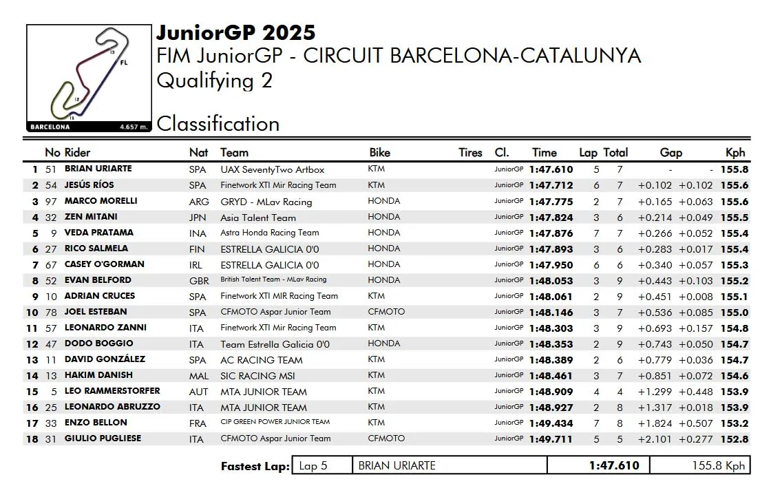 Sementara itu, Brian Uriarte (UAX SeventyTwo Artbox) meraih lima posisi pole berturut-turut di JuniorGP 2025. Uriarte meraih pole position Demi kedua balapan di Circuit de Barcelona-Catalunya dengan catatan waktu 1:47,610.