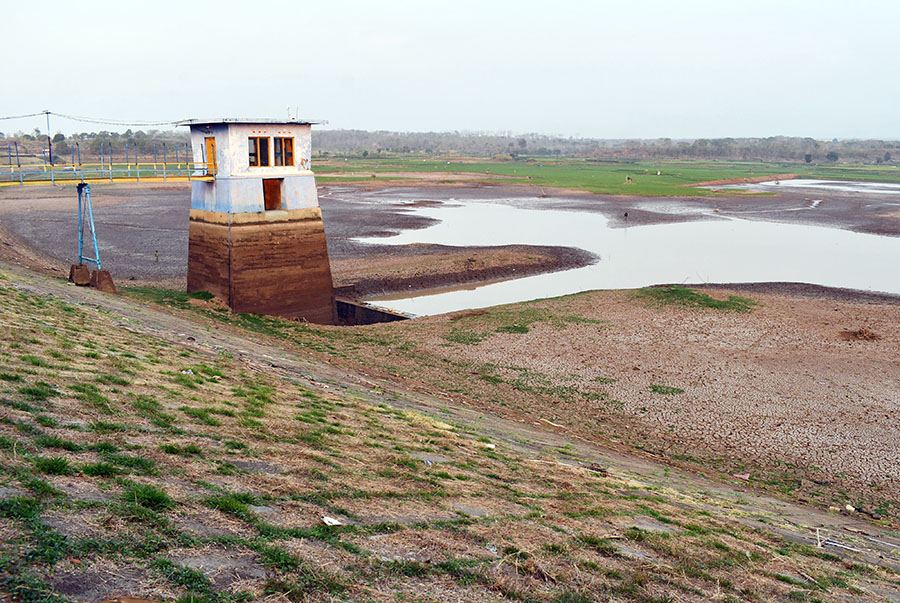 Kondisi Waduk Dawuhan yang airnya menyusut di Kabupaten Madiun, Jawa Timur, Senin (15/9/2025). Waduk yang Mempunyai daerah irigasi seluas 2.823 hektare sawah tersebut tinggal menyisakan sedikit air dengan sebagian besar dasar waduk mengering hingga tak Bisa mengalir ke saluran irigasi akibat musim kemarau. ANTARA/Siswowidodo/gus