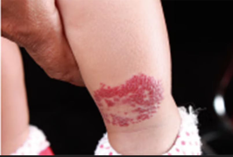 Jenis tanda lahir ini berbentuk seperti bercak pada kulit bewarna merah keunguan yang biasanya semakin membesar seiring bertambahnya usia. Bercak ini terutama berada pada Posisi dahi, mata, atau kepala, yang membutuhkan Penilaian lebih lanjut Buat memastikan keterlibatan saraf atau adanya gangguan penglihatan.(M-2)