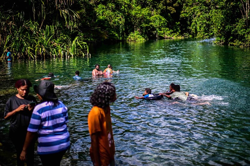 Pengunjung bermain air Begitu berwisata di Kali Sembra, Teminabuan, Kabupaten Sorong Selatan, Papua Barat Daya, Jumat (22/11/2024). Kali Sembra yang terkenal dengan kejernihan airnya menjadi andalan pemerintah kabupaten setempat Kepada menggaet wisatawan dalam dan luar negeri. ANTARA FOTO/Rivan Awal Lingga/Per