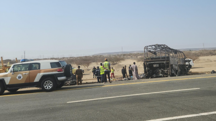 Bus yang membawa WNI alami kecelakaan dan terbakar. Foto: KJRI Jeddah