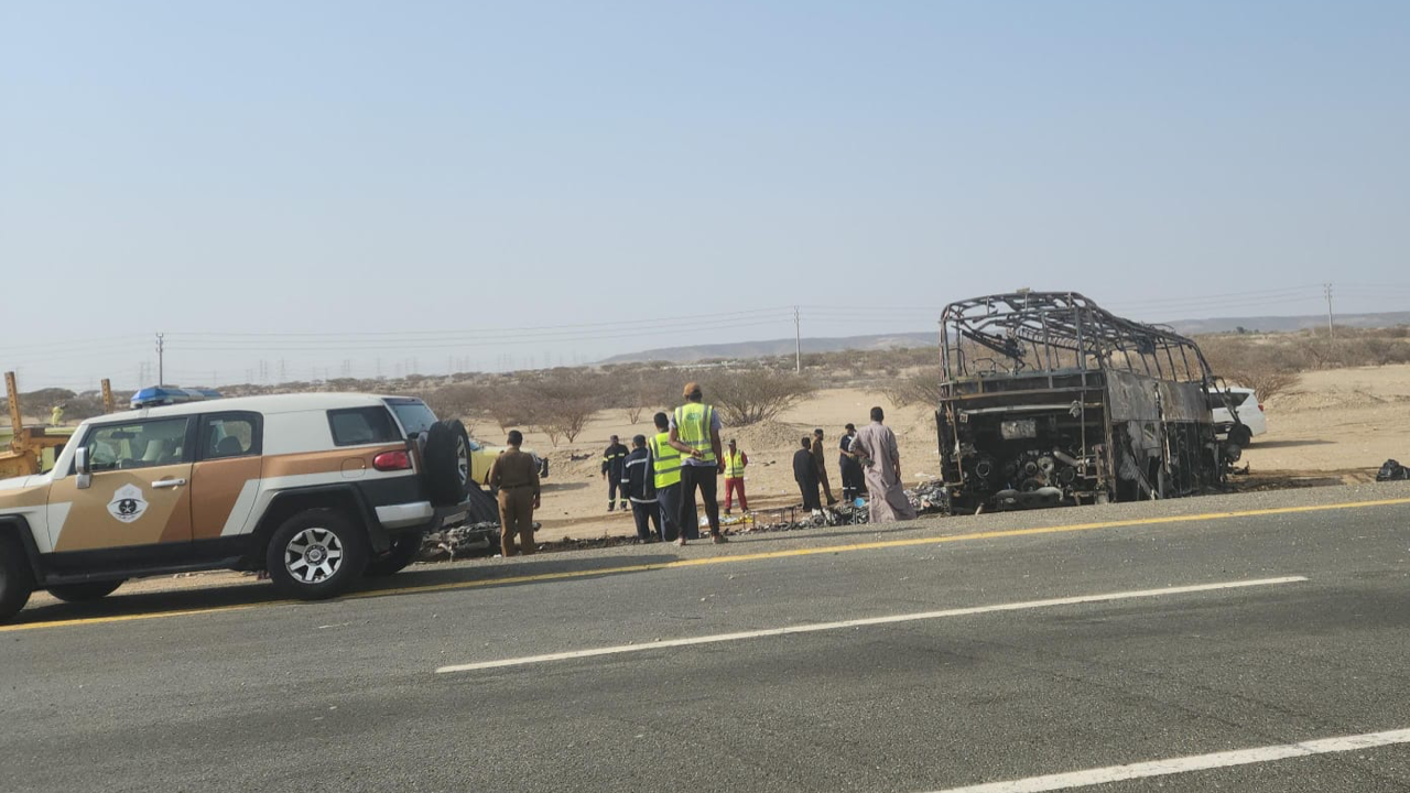Bus yang membawa WNI alami kecelakaan dan terbakar. Foto: KJRI Jeddah