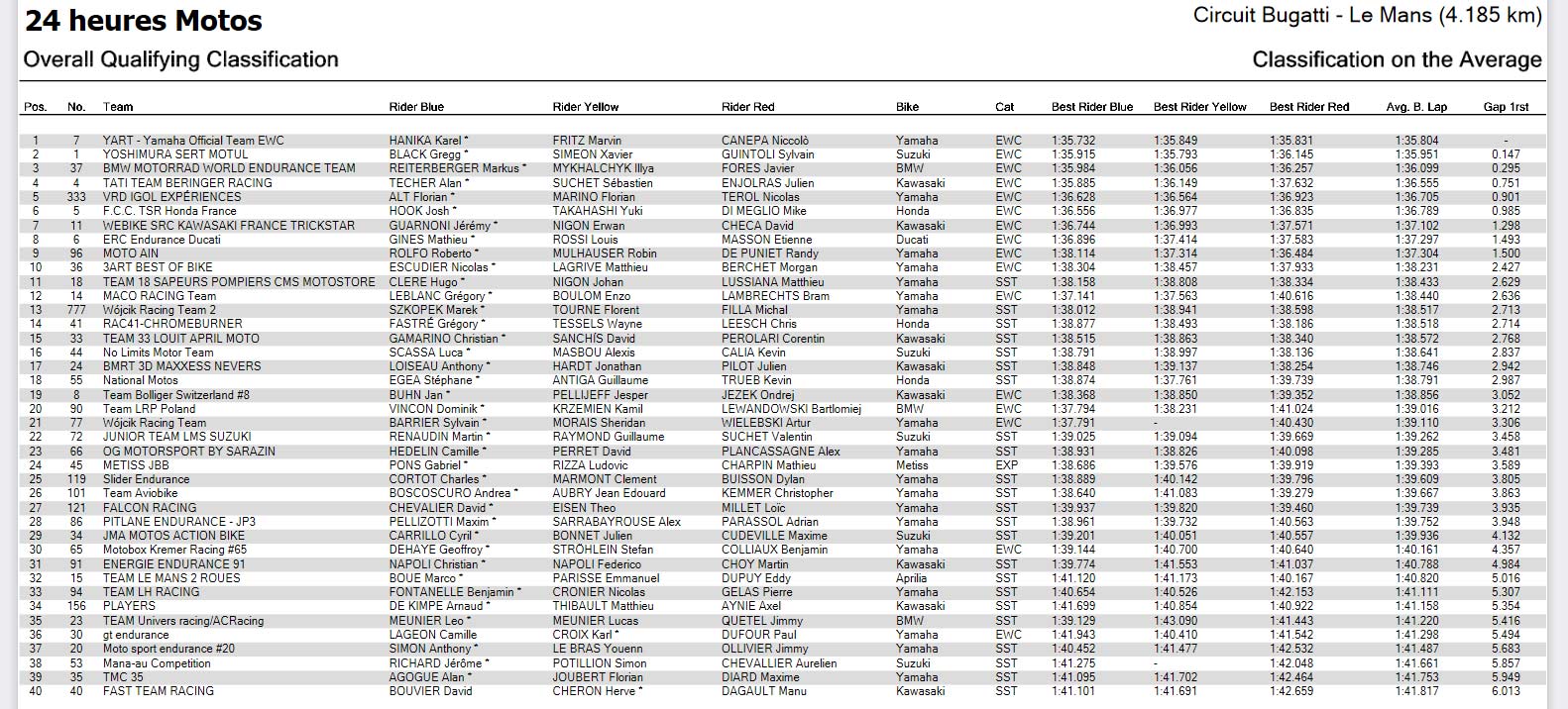 team Pabrikan BMW yang diperkuat Markus Reiterberger berada di Posisi ketiga sementara Tati team Yang menggunakan Kawasaki ZX-10R Membangun Posisi Top 4 Kualifikasi 24 heures Motos dihuni oleh empat motor dari pabrikan yang berbeda Yamaha, Suzuki, BMW dan Kawasaki. Sementara Itu Honda Via tim FCC TSR Honda Hadir di Posisi ke 6 dan Ducati Via tim ERC Endurance Ducati berada di posisi ke 8.