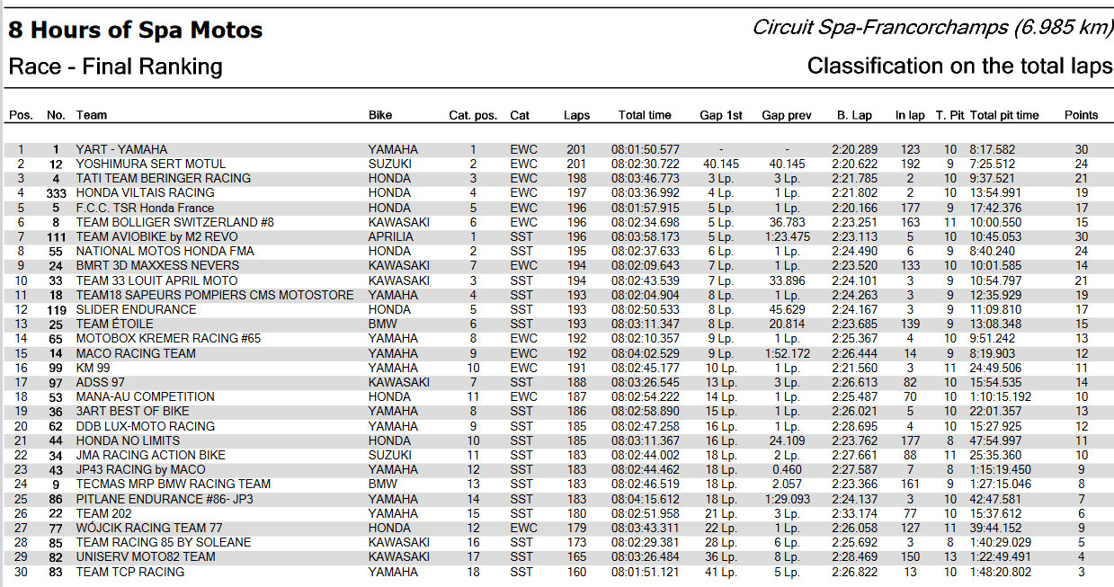 Hal itu Membikin pertarungan demi kemenangan tetap hidup di venue ikonik Belgia tersebut hingga jam terakhir ketika Yoshimura SERT Motul yang ditenagai Suzuki GSX1000RR, pemenang Le Mans 24H pada bulan April, secara efektif terpaksa menyerahkan posisi pertama kepada YART dengan selisih tipis 40,145 detik.