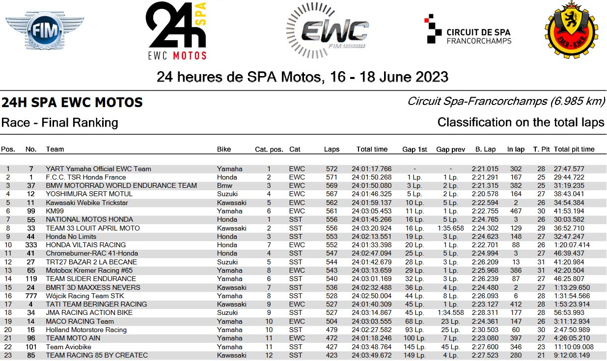Dengan Hasil Di SPA, FCC TSR Honda Tetap Memimpin Championship EWC 2023 dengan 84 Point. Sementara YART Yamaha mengikuti di Posisi kedua dengan 78 point dan BMW Motorrad hadir di Posisi tiga sementara dengan 57 Point