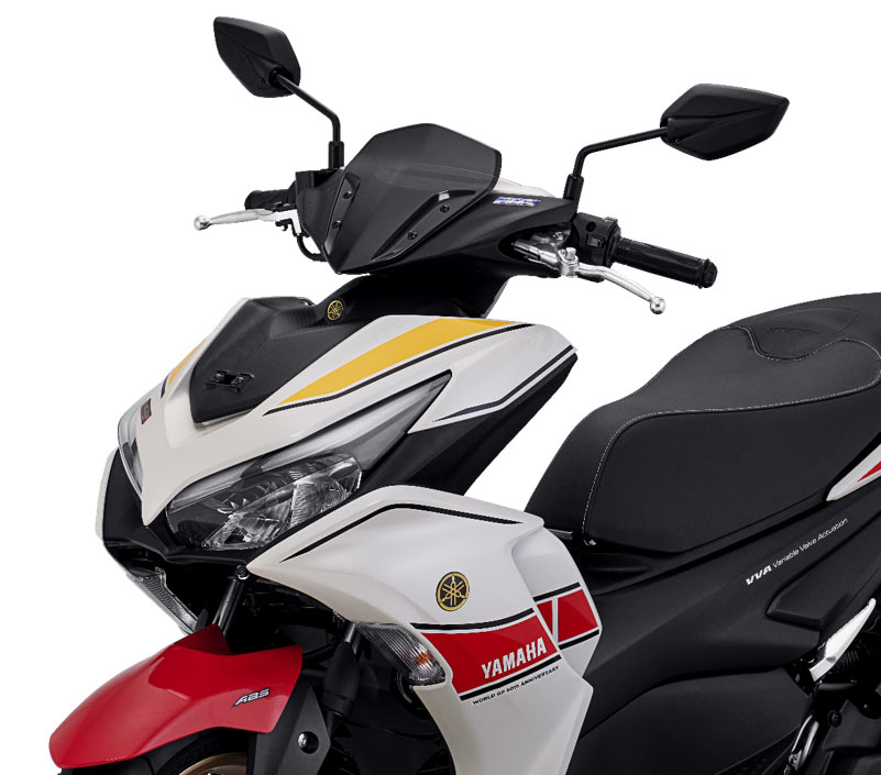 Ketika livery tersebut diadopsi ke tubuh All New Aerox 155 Connected ABS, aura sporty terasa begitu kuat melalui kombinasi Rona putih yang dominan dengan sentuhan garis merah yang membentang di sisi kanan dan kiri body motor. Pada garis merah tersebut, turut diaplikasikan grafis “Speed Block” yang menjadi simbol dan identitas dari Yamaha Racing Team.