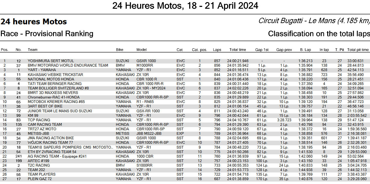 pada akhirnnya Yoshimura SERT Motul finish pertama dan memenangkan Balapan 24 jam Le Mans ini disusul BMW Motorrad di Posisi dua dan YART Yamaha di Posisi tiga. FCC TSR Honda France Kagak finish pada balapan ini.